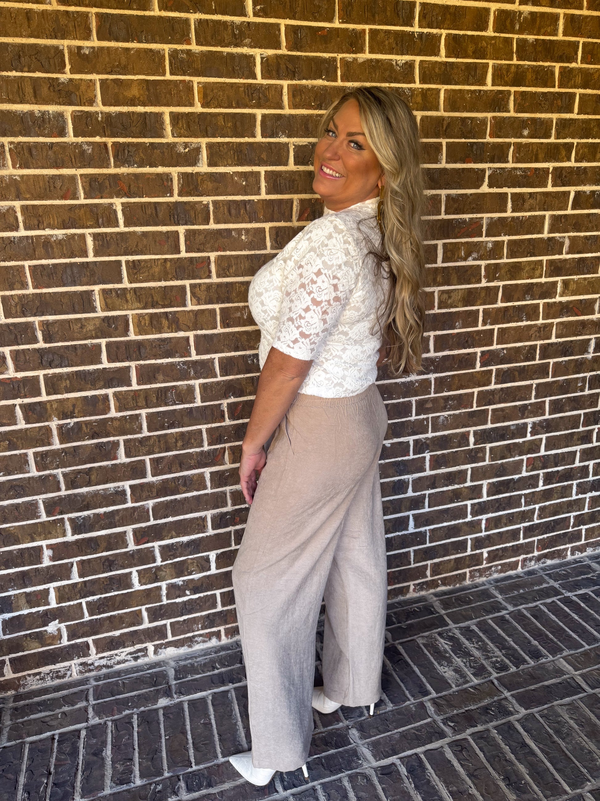 Keep it effortless and elevated in our Chic Comfort Beige Pants. Made with a lightweight linen-blend fabric, these relaxed-fit trousers feature a high-rise elastic waistband with an adjustable drawstring for the perfect mix of comfort and style. The neutral beige tone makes them easy to pair with anything—from lace tops and heels for a dressy look to sneakers and a tee for laid-back vibes.