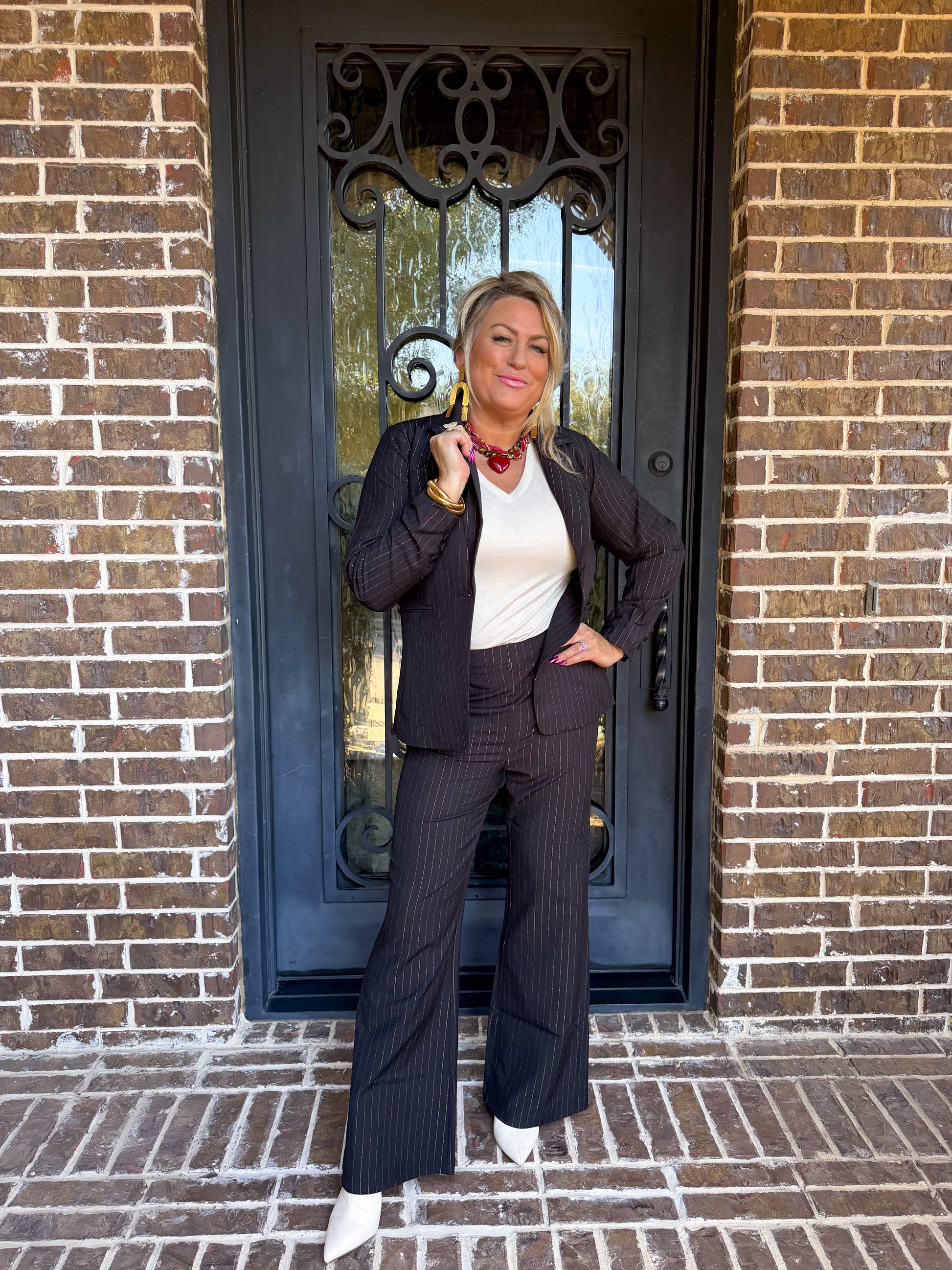 Step into effortless power and polished style with our Black & Gold Pinstripe Pantsuit Set. This two-piece look features a tailored blazer and matching wide-leg trousers, designed with subtle gold pinstripes that add the perfect touch of elevated glam. Dress it up for the office, holiday parties, church, or any event where you want to look confident, classy, and put-together.