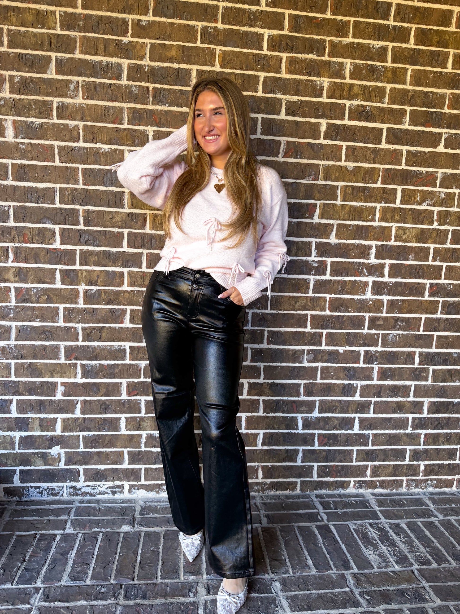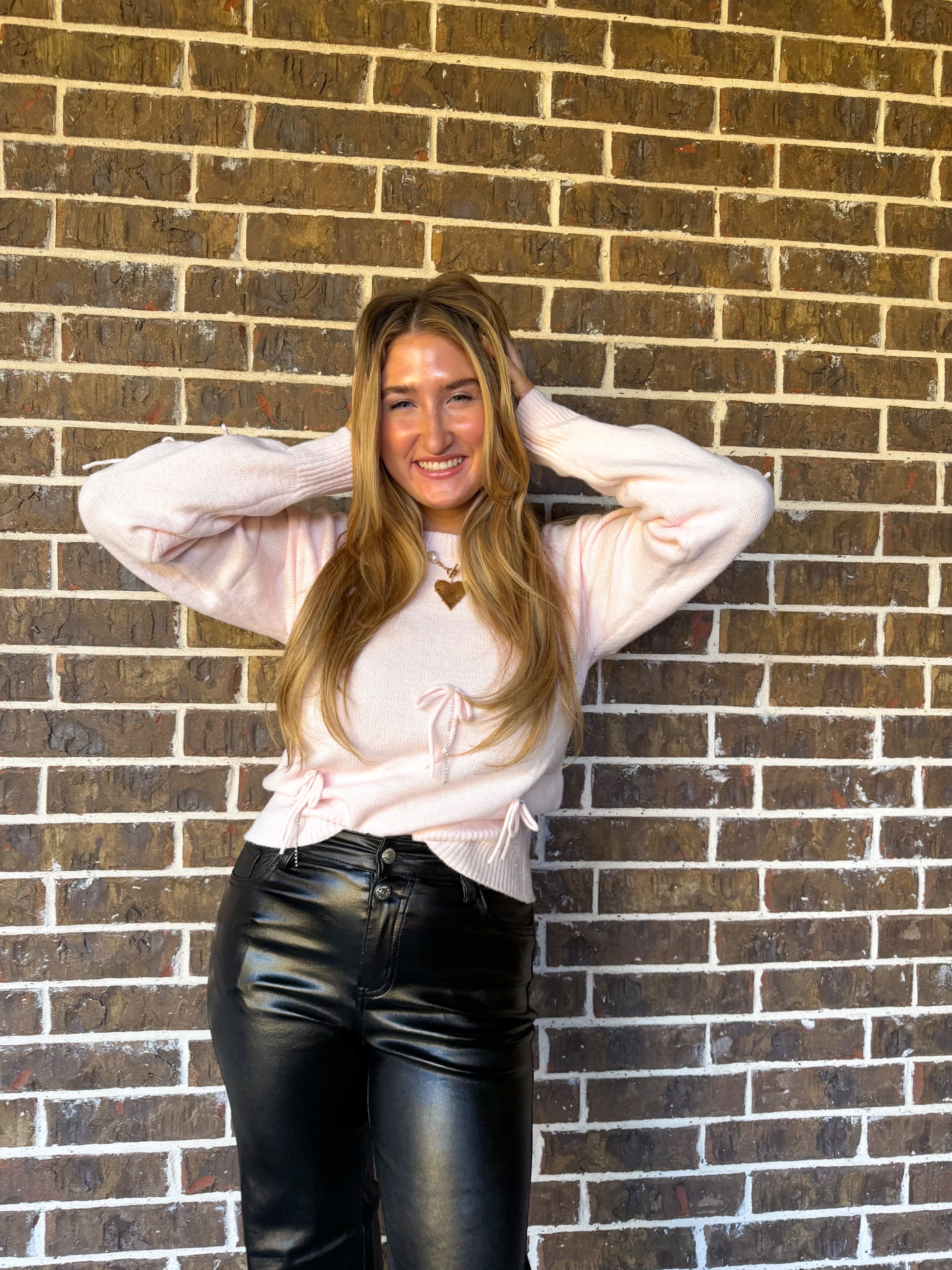 Add a touch of charm and sparkle to your wardrobe with this Pink Bow & Rhinestone Embellished Sweater. Crafted from a soft, mid-weight knit, this sweater combines cozy comfort with eye-catching detail. Delicate knit bows and cascading rhinestone strands are placed across the front and sleeves, creating a feminine, elevated look that stands out effortlessly.