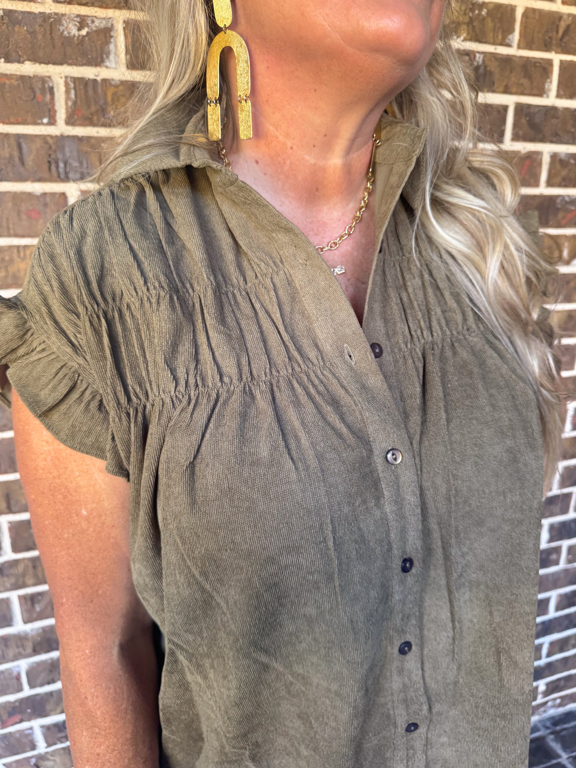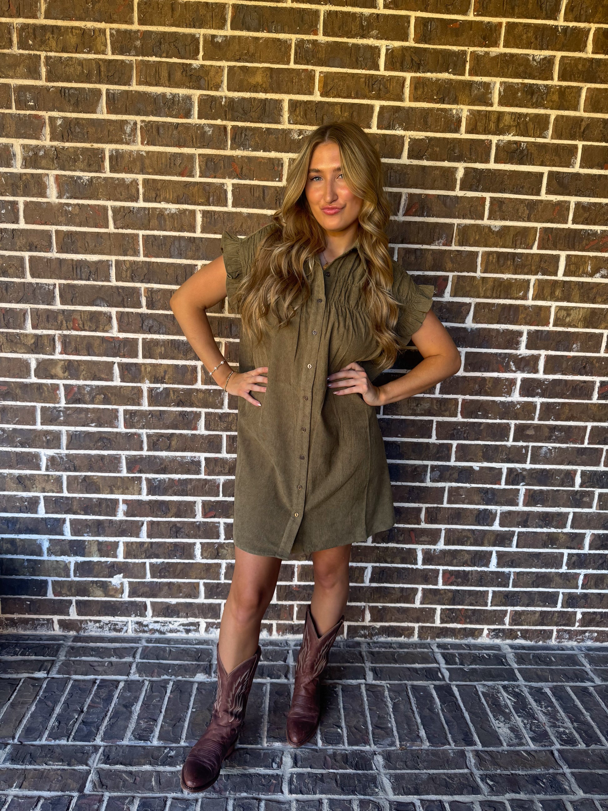 Step into effortless fall style with our Olive Corduroy Button-Up Dress. This soft, lightweight corduroy dress features a flattering collared neckline, ruffle sleeves, and front button detail for a classic yet trendy look. The olive green tone makes it a versatile piece that transitions seamlessly from casual days to dressed-up evenings.