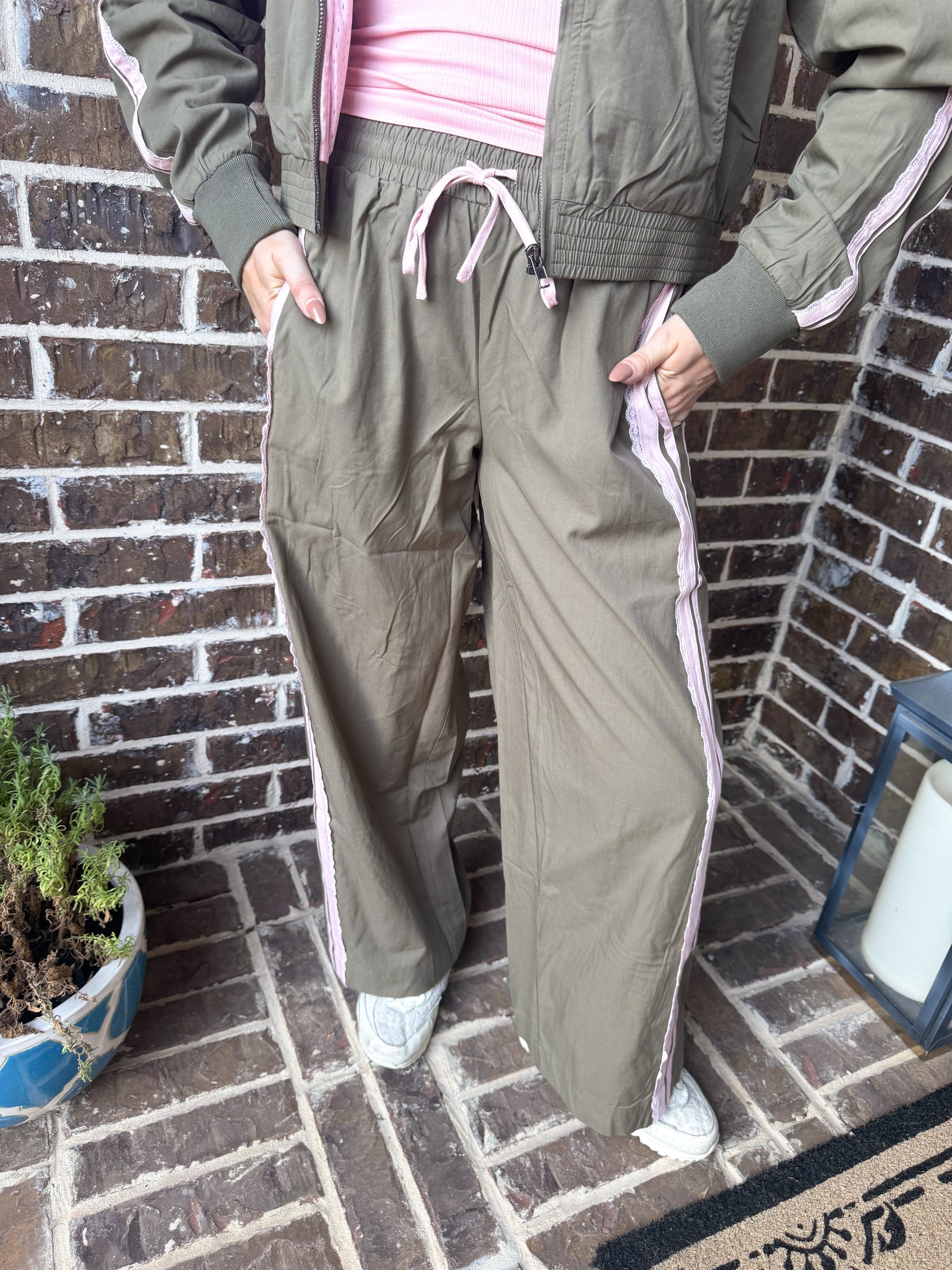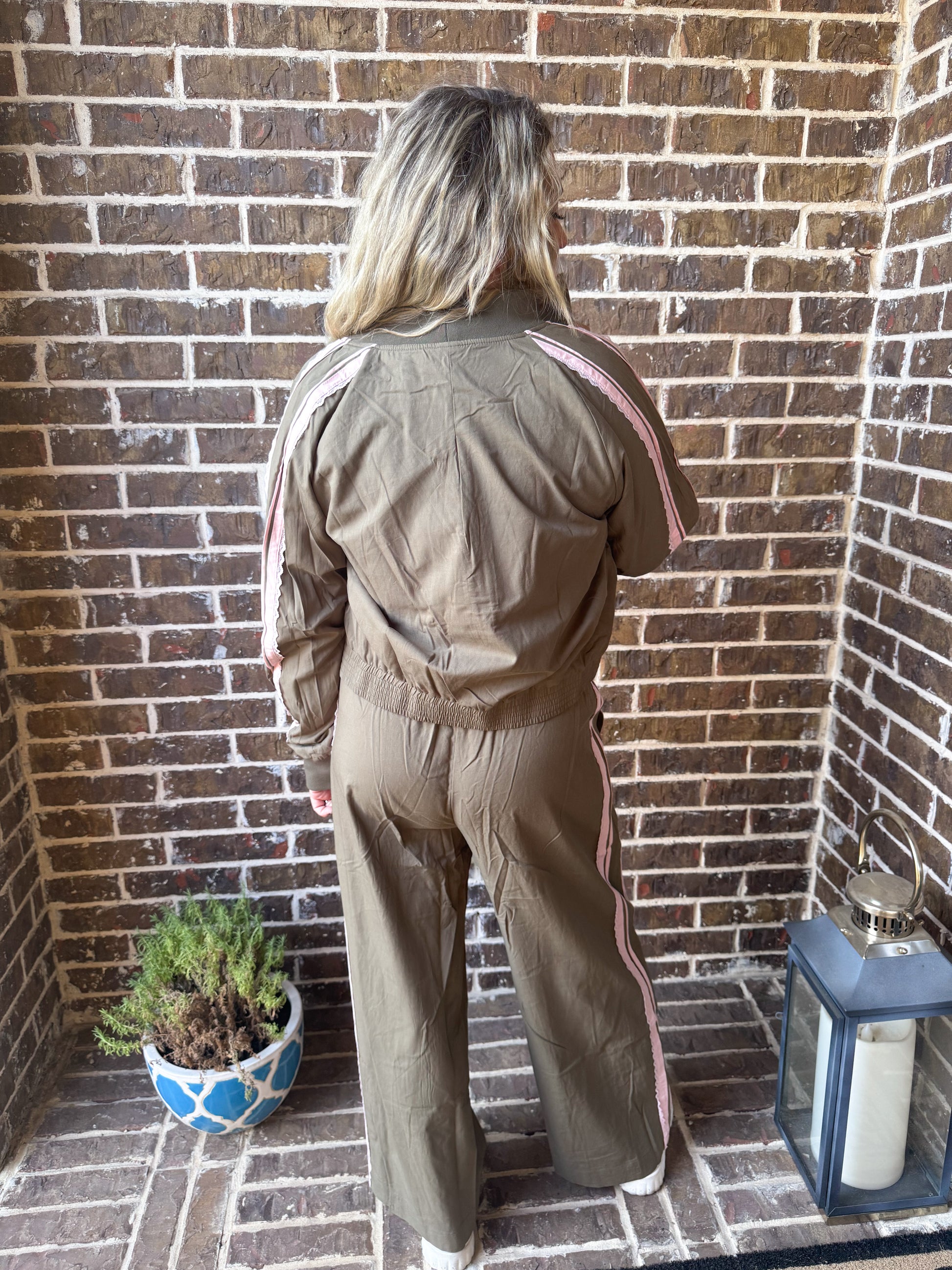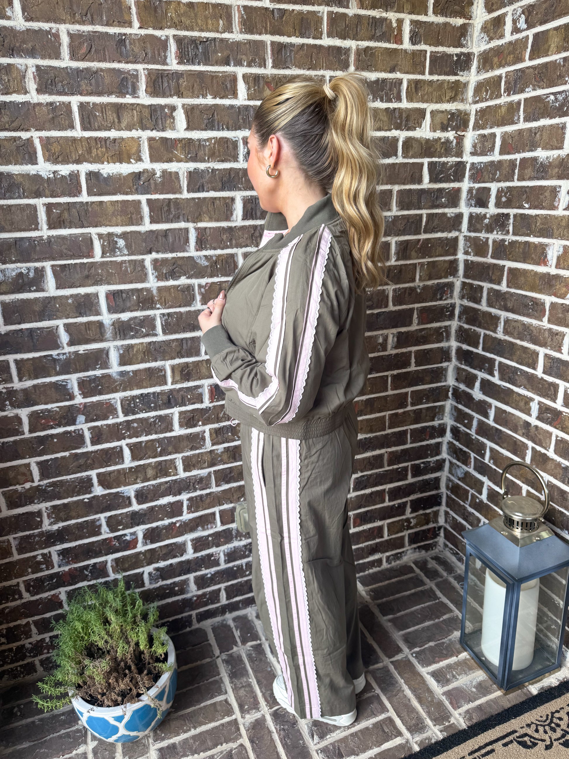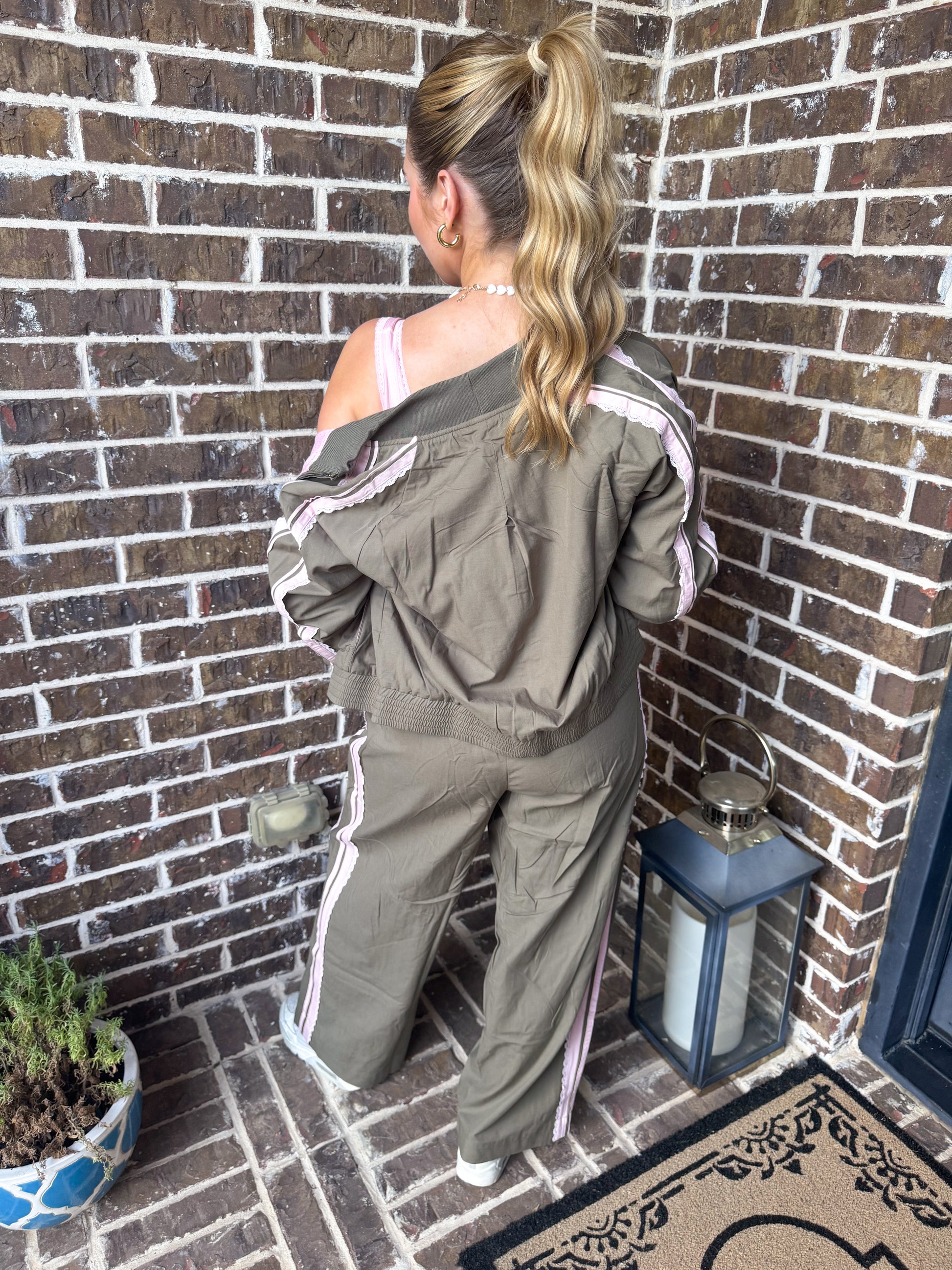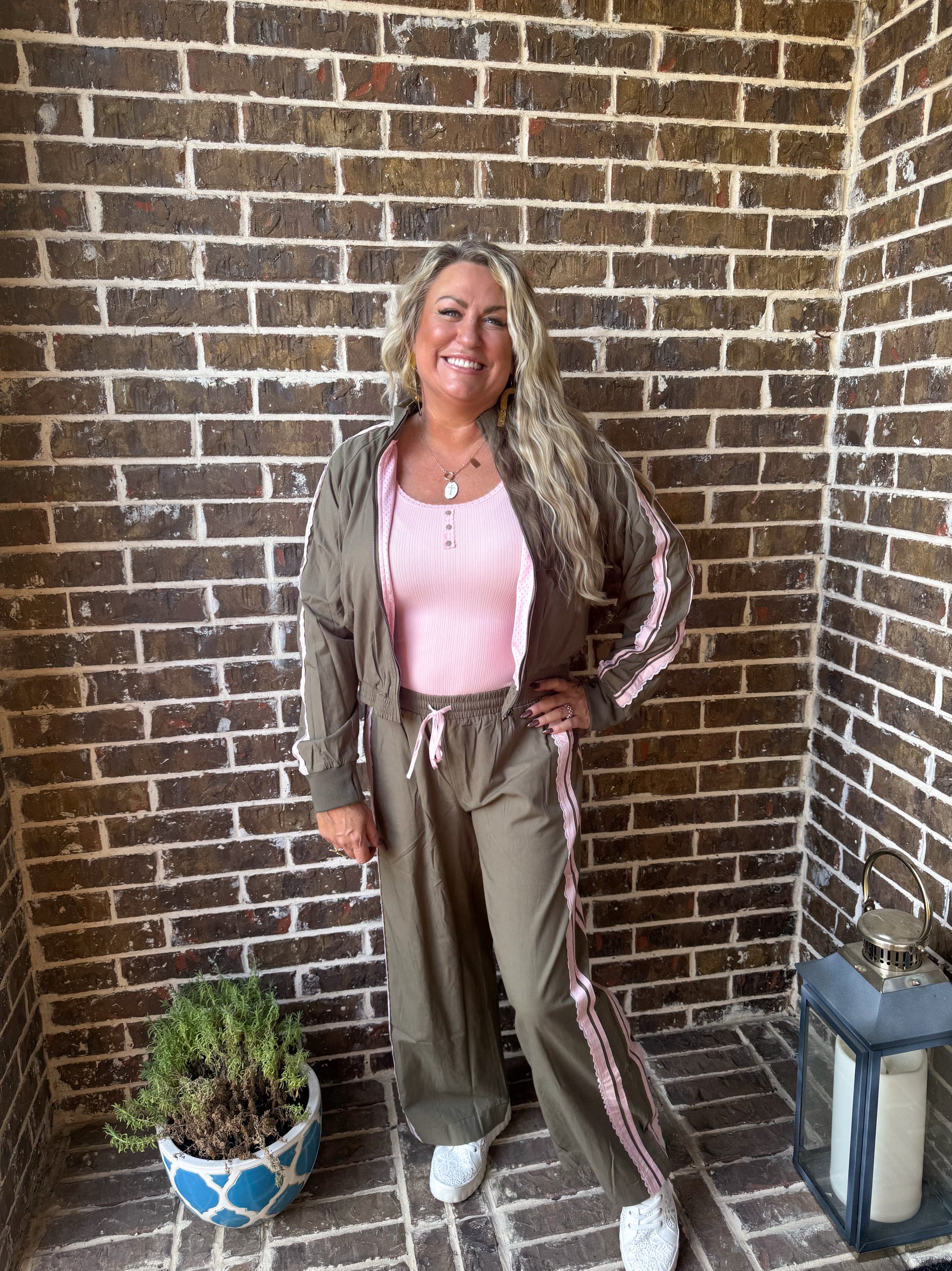 Elevate your off-duty style with our Olive & Blush Lounge Set, the perfect mix of comfort and trend. Featuring a relaxed fit, wide-leg bottoms with a drawstring waist, and a zip-up jacket with blush pink detailing, this set was made to move with you. From lounging at home to running errands or casual outings, it’s your go-to outfit for looking effortlessly put together.